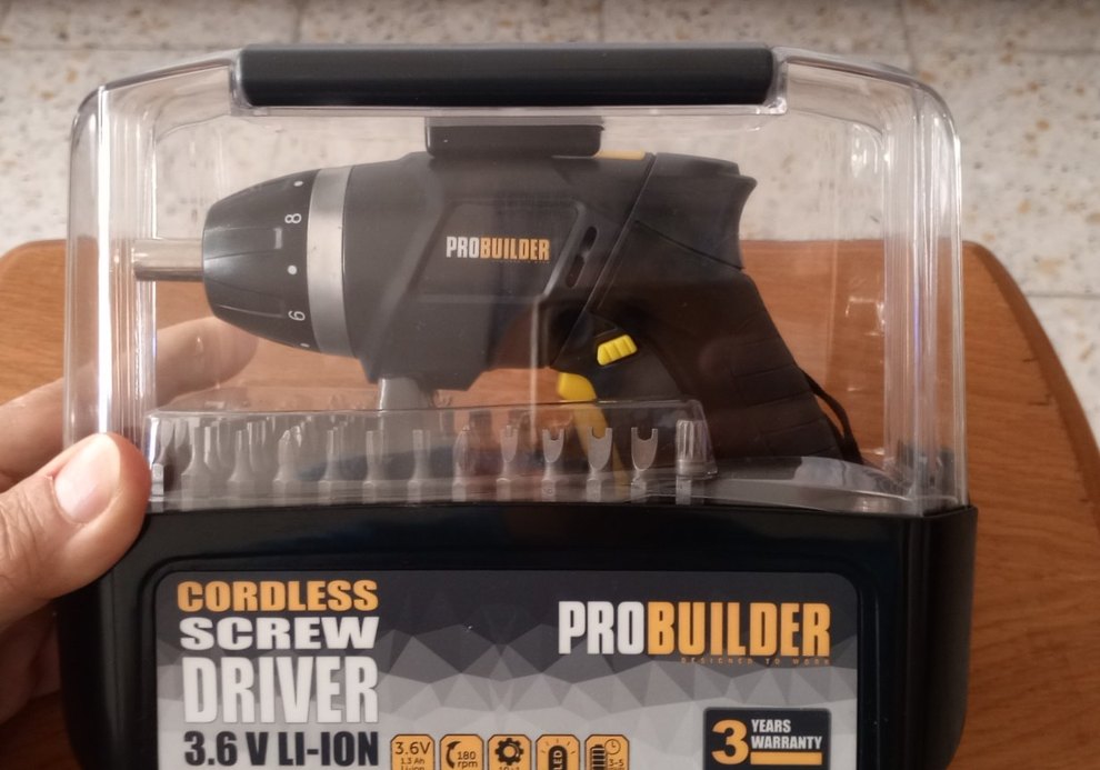 Probuilder kablosuz matkap, 3.6V lityum iyon batarya ve çeşitli uçlarla birlikte gelir. 180 RPM hız sunar.