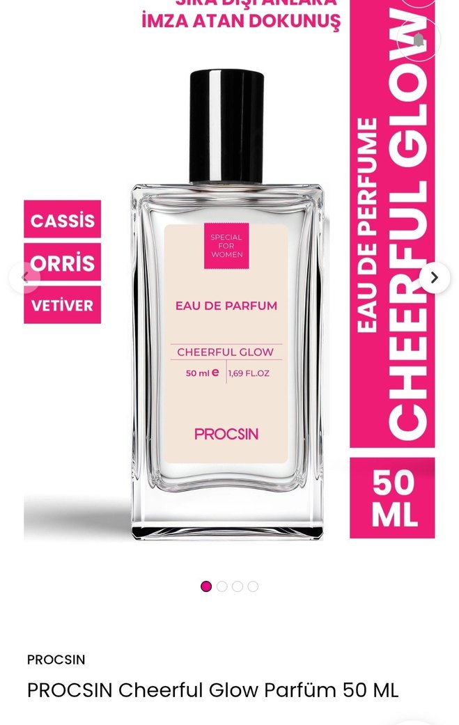 Procsin Cheerful Glow kadın parfümü, 50 ml eau de parfum olup cassis, orris ve vetiver notalarıyla taze ve canlı bir koku sunar.