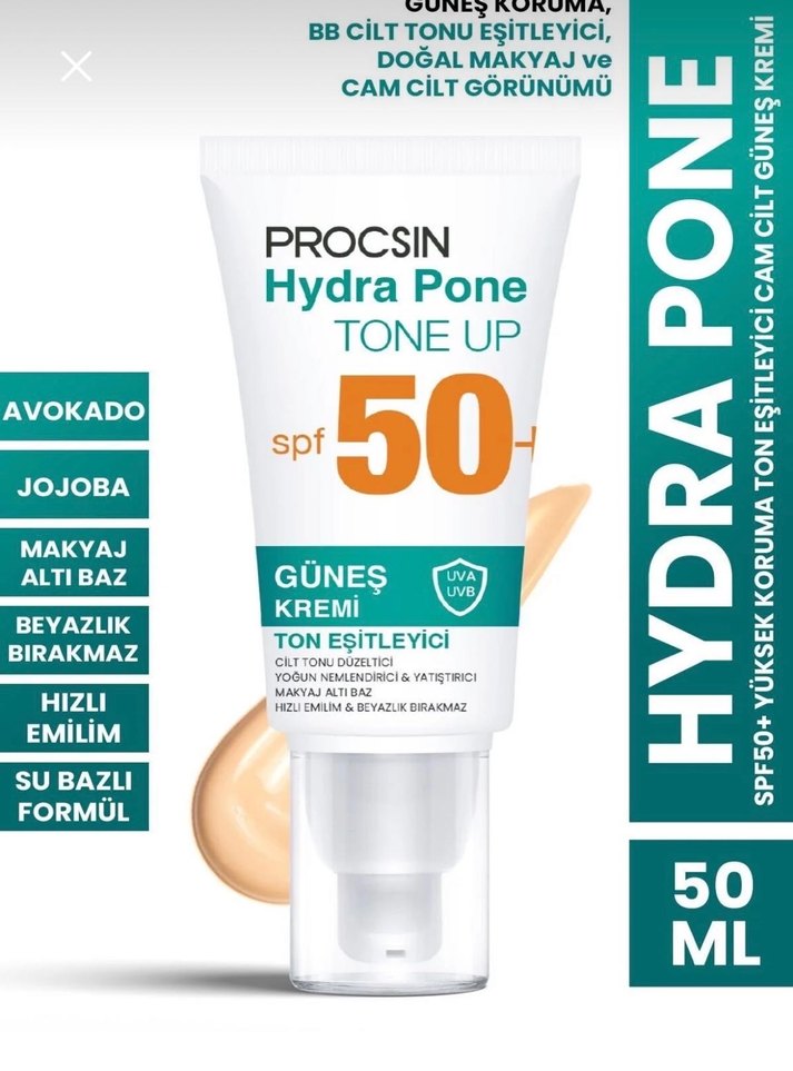 Procsin Hydra Pone SPF 50 güneş kremi, jojoba ve avokado içerir. Cilt tonu eşitler, doğal makyaj görünümü sağlar, hızlı emilir ve beyazlık bırakmaz.