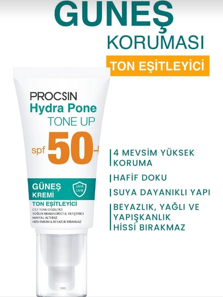 Procsin Hydra Pone SPF 50 güneş kremi, 4 mevsim yüksek koruma sağlar. Hafif dokulu, ton eşitleyici, suya dayanıklı ve yapışkanlık hissi bırakmaz.