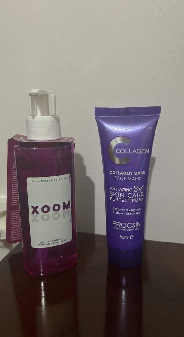 Procsin kollajen yüz maskesi yaşlanma karşıtı cilt bakımı sağlar, Xoom yüz temizleyici ise vitamin kompleksi ve amino asitlerle nazikçe temizler. 80ml.