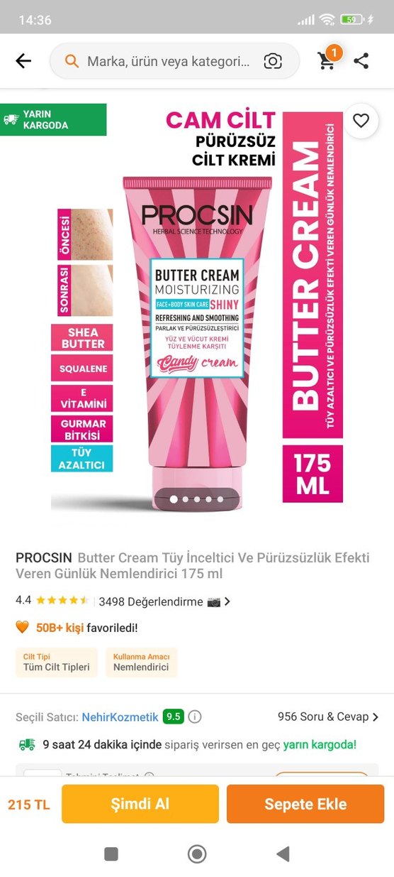 Procsin Butter Cream, tüy inceltici ve cildi pürüzsüzleştirici etkiye sahip nemlendirici kremdir. Shea butter, squalene, E vitamini ve gurmar bitkisi içerir. Tüm cilt tiplerine uygundur, 175 ml.sadece 1 kere kullandım artık gerek kalmadığı için satıyorum binlerce seveni var YÜZLERCE SATIŞIM BİNLERCE TAKİPÇİM VAR DİĞER ÜRÜNLERİME DE GÖZ ATIN LÜTFEN #beaulis #hastaneçıkış #fotoğrafçekimi #hediye #mevlit #yenidoğan #intimissimi #oysho #penti #kom #gecelik #dagi #victoriasecret #hm #zara #pierrecardin #suwen #sabanlık #10luset #çeyiz #bohça #hediye