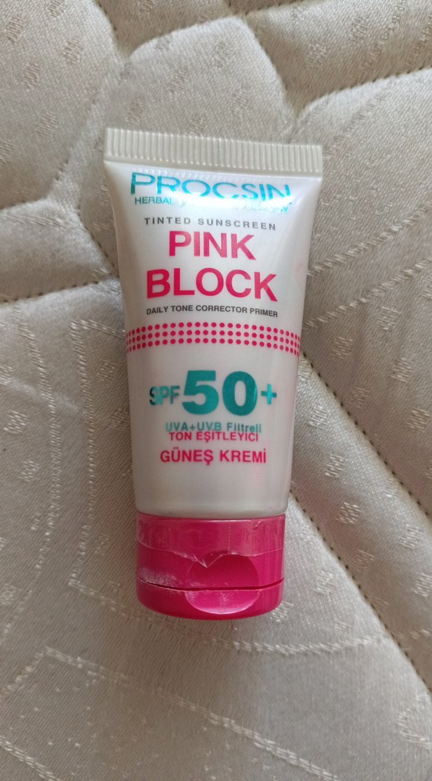 Procsin Pink Block güneş kremi, SPF 50+ ile UVA ve UVB filtreleri sunar. Ton eşitleyici ve günlük primer olarak da kullanılır.