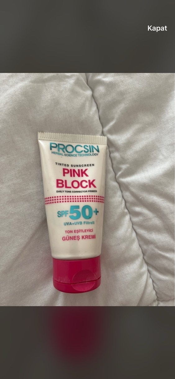Procsin Pink Block ton eşitleyici güneş kremi SPF 50+ koruma sağlar, UVA ve UVB filtrelidir. Cilt tonunu eşitlerken güneşten korur. YARI DOLU