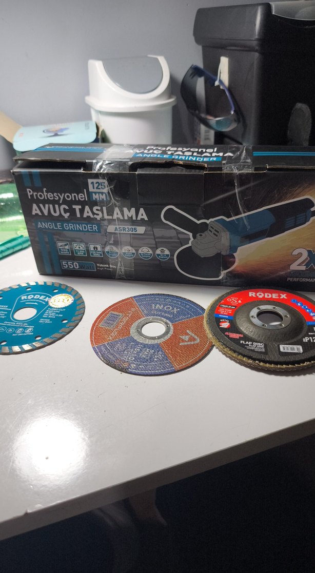 Profesyonel 125 mm çapında ve 550 W motor gücüne sahip avuç taşlama makinesi. dört farklı taşlama diski ile birlikte gelir. ⚙️