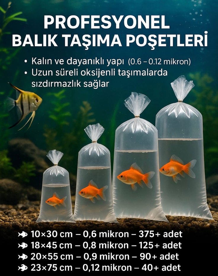 Kalın ve dayanıklı yapıya sahip profesyonel balık taşıma poşetleri (0.6-0.12 mikron). Uzun süreli oksijenli taşımada sızdırmazlık sağlar. Farklı boy seçenekleri mevcuttur.