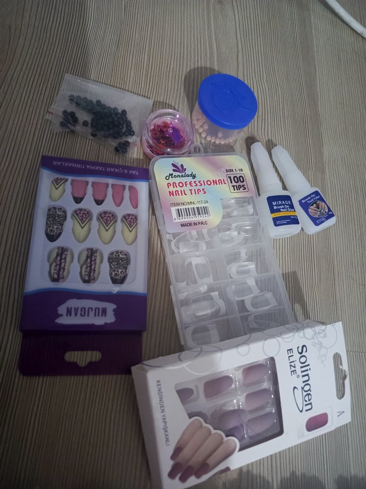 Solingen markalı, mor tonlarında 100 profesyonel tırnak ucu ve çeşitli süslemeler içeren tırnak dekorasyon seti.