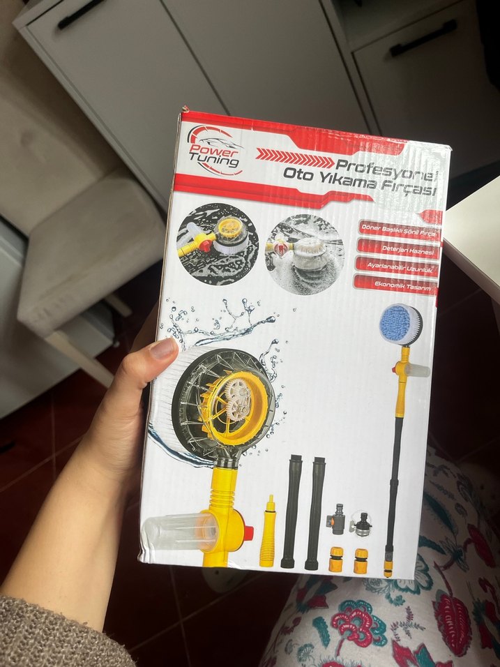Profesyonel oto yıkama fırçası, sarı ve gri renklerde, su tankı ve ayarlanabilir parçalarla detaylı temizlik sağlar.