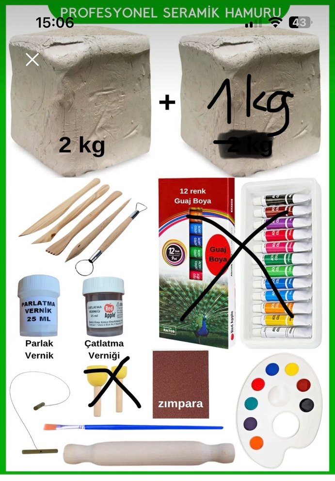 seramik hamuru, 25 ml parlak vernik, çatlatma verniği, zımpara ve heykel araçları içeren set. Çarpı işareti koyduklarım hariç hepsi mevcut kil çok az kullanıldığı için 3-3,5 kg kaldı yeni alıcısını bekliyor, güzel işler çıkaracağınızdan eminim