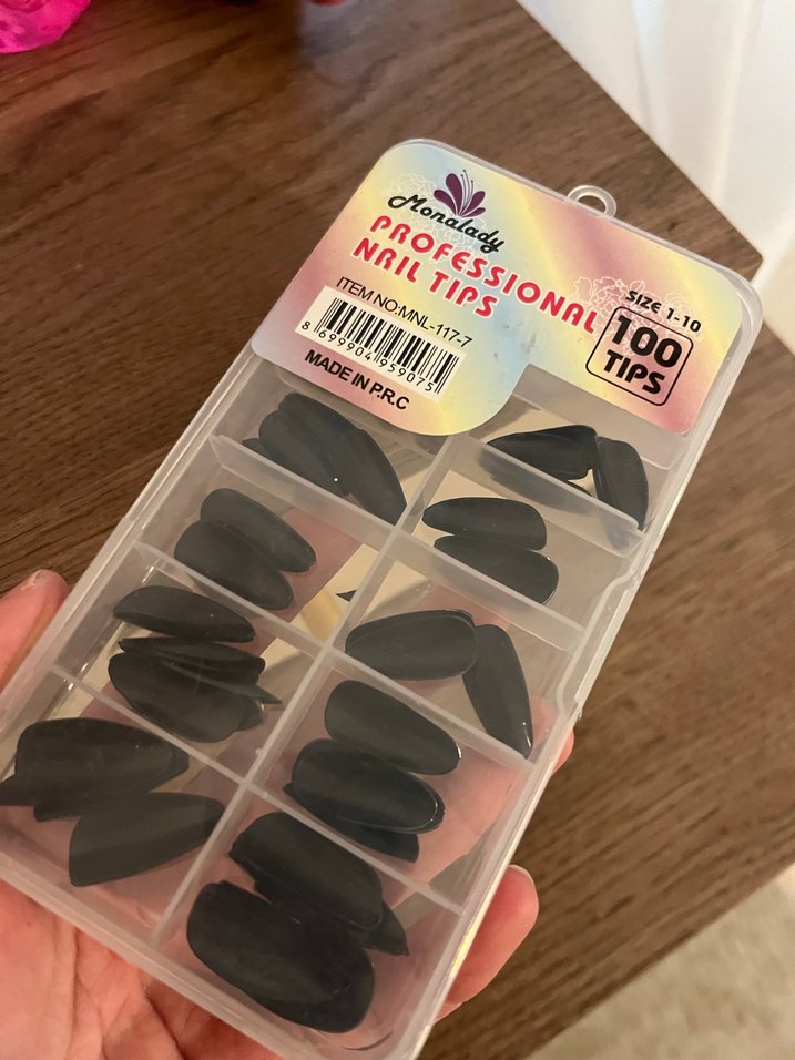 Çeşitli boylarda siyah profesyonel tırnak ucu, plastik kutuda düzenli şekilde sunulmuştur. Tırnak süslemeleri için uygundur.