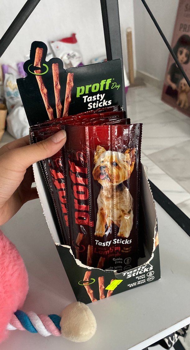 Proffo Tasty Sticks, kuzu aromalı, tahılsız köpek ödül çubuklarıdır. Pratik paketlerde, lezzetli bir ödül olarak sunulur.