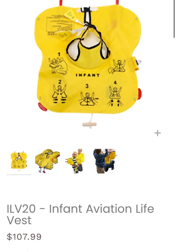 Sarı renkli bebek önlüğü, renkli baskılı havacılık yaşam talimatlarıyla bebekler için tasarlanmıştır. Net çizimler ve güvenli boyun bağı içerir.