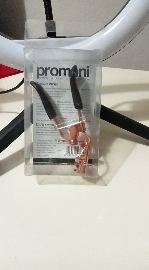 Promani kirpik kıvırıcı, bej renkte ve koyu renk tutacaklı, kirpikleri şekillendirmek için tasarlanmıştır.