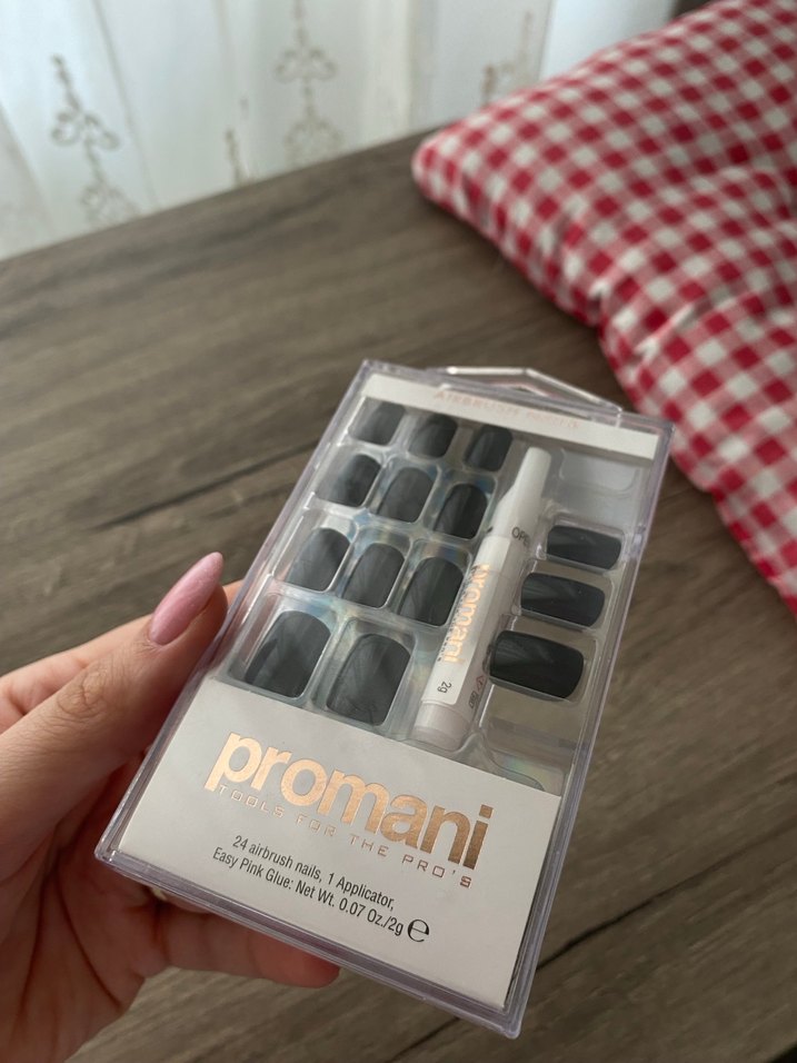 Promani markalı siyah takma tırnak seti. Kutusunda, hiç kullanılmadı. 24 adet takma tırnak + yapıştırıcı ve aplikatör seti tamdır. Evde pratik kullanım için ideal. Fotoğraflar ürüne aittir.