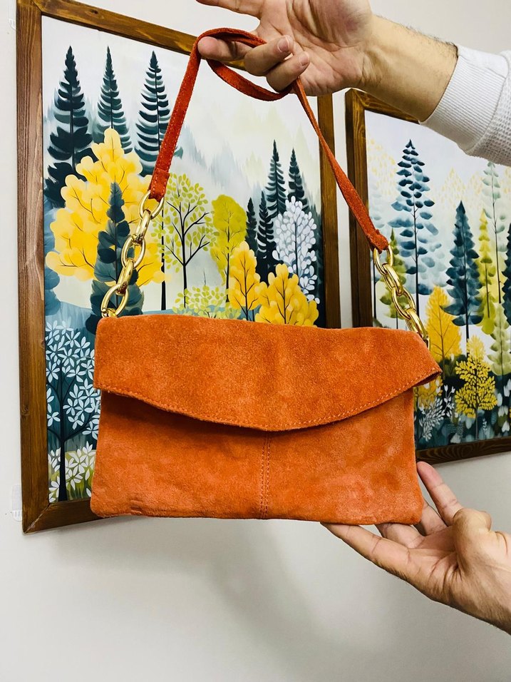 Yumuşak süetten yapılmış, turuncu renkli, bel detayı ve batik desenli bohem tarzda kadın çantası, günlük kullanım için uygundur.