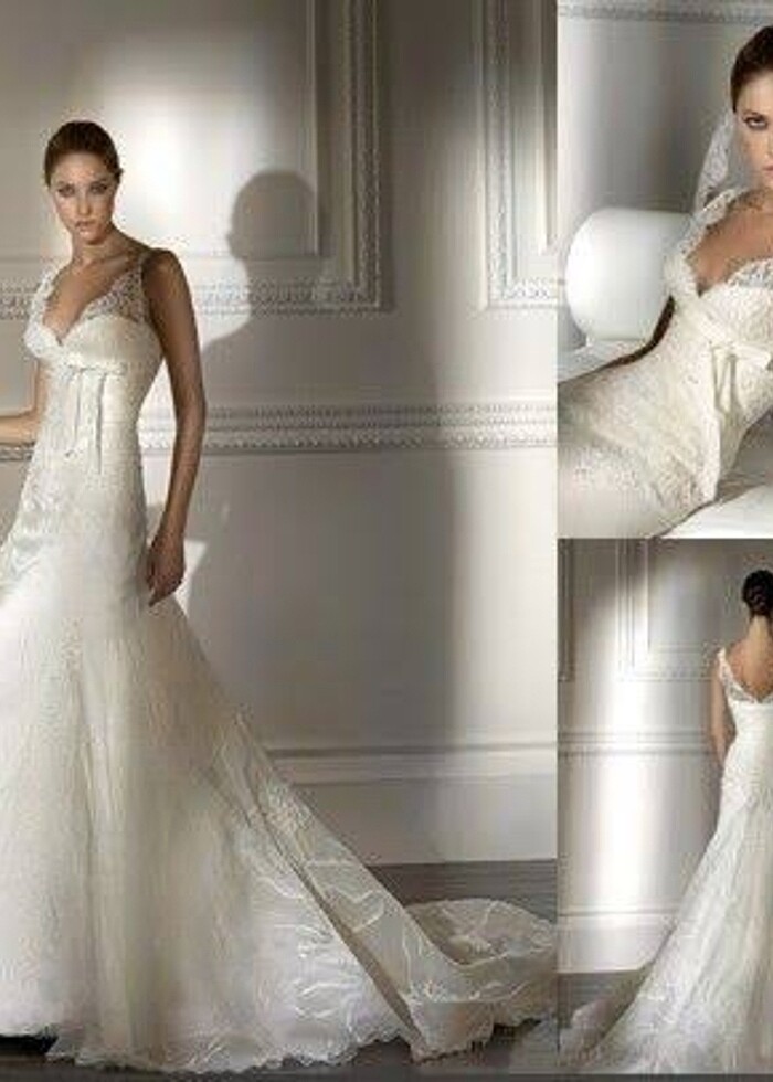 Pronovias dan alınmıştır. Temizlenip saklanmıştır, temizdir. Kuru temizleme ütü ile ilk günkü gibi olur. 34 bedendir. Duvak yoktur. Kuyruk kısmı arkadan toplanabiliyor. Göğüs kısmı derindi ayarlandı. Benim gibi çok zayıf olanlar (50 kilo, boy 1,67) 1.60 boy ve üzeri için ideal. Ne çok sade ne gösterişli, tam arada, üstü dantel, alt kısımlarda ara ara dantel var. Ankara da olanların almasını isterim.İSTENİLİRSE düz duvak ve 37 numara ayakkabı hediyedir.