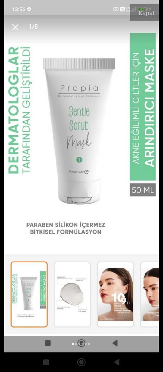 Propia Gentle Scrub Mask, paraben ve silikon içermeyen bitkisel formülüyle 50ML, akne eğilimli ciltler için nazikçe temizler.