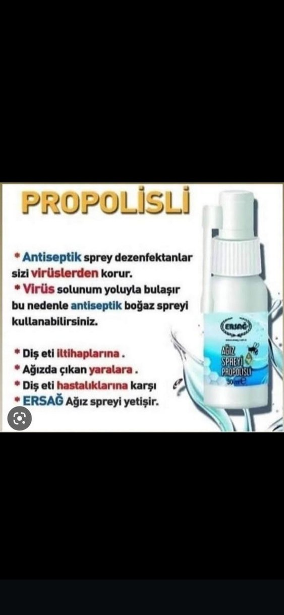 Propolis içeren antiseptik ağız spreyi, virüslere karşı korur, diş eti iltihapları, ağız yaraları ve diş eti hastalıklarına karşı etkilidir. Boğaz spreyi olarak da kullanılabilir.