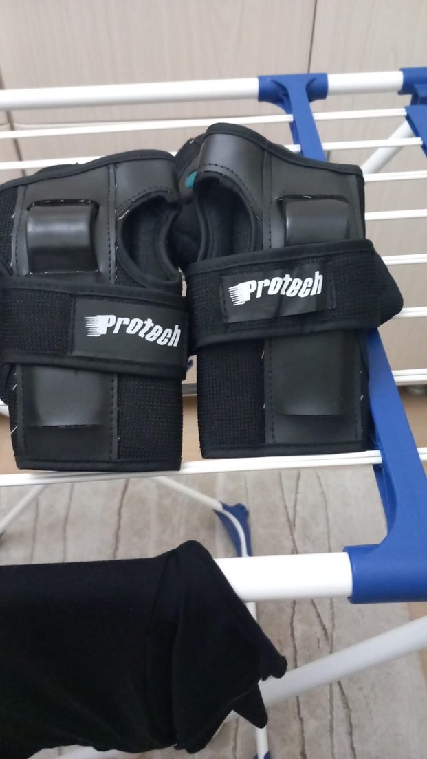 Protech marka siyah bilek koruyucu, kauçuk koruma ve cırt cırtlı bantlarla güvenli kullanım sunar. Street wear ve athleisure tarzına uygundur. Temiz ve hasarsızdır.