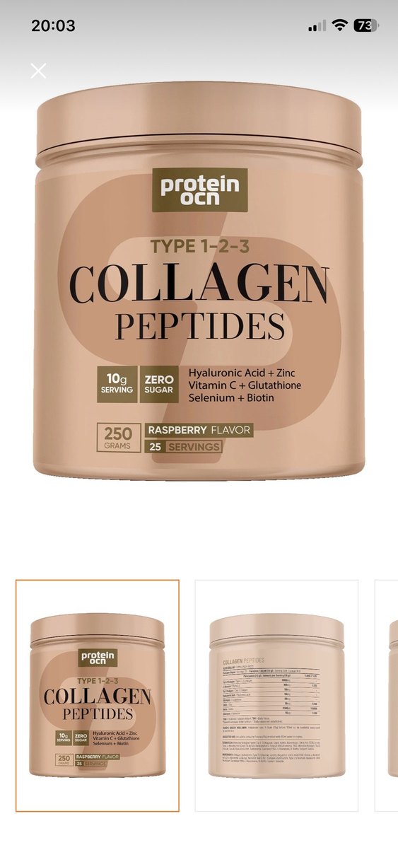 Protein OCN kolajen peptit 250g, ahududu aromalı, tip 1-2-3 kolajen, 10g peptit, sıfır şeker, vitamin C, glutasyon, hyalüronik asit, çinko, selenyum ve biotin içerir. 2-3 defa kullanıldı