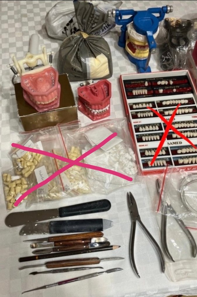 2 adet plastik çene,modelaj spatülleri 6 adet,bol, bol kaşığı, alçı bıçağı,sabit kalem, 2adet wazlaks pensi, kroşe teli, 8adet basplak(ısıyla sertleşen), 1’er adet dişsiz ve dişli alt-üst çene matrix alçı kalıbı, 1adet üst ve alt çene ölçü kaşığı, 1adet artikülatör, 1 adet metal okluzol, 2kutu modelaj mumu(adetlerini fotoğrafta çektim), sert alçı(paketin yarısı dolu) ve aljinat(paketin çeyreği dolu). #diş #hekimliği #fakültesi #üniversite #protez #protetik #laboratuvar #lab #preklinik #klinik #staj #hekim #fakülte #diştedavisi #öğrenci #anasayfa #keşfet #katalog #gardrops #yeni #sıfır #ayarında #ürün #ürünler #malzemesi #malzeme #malzemeler