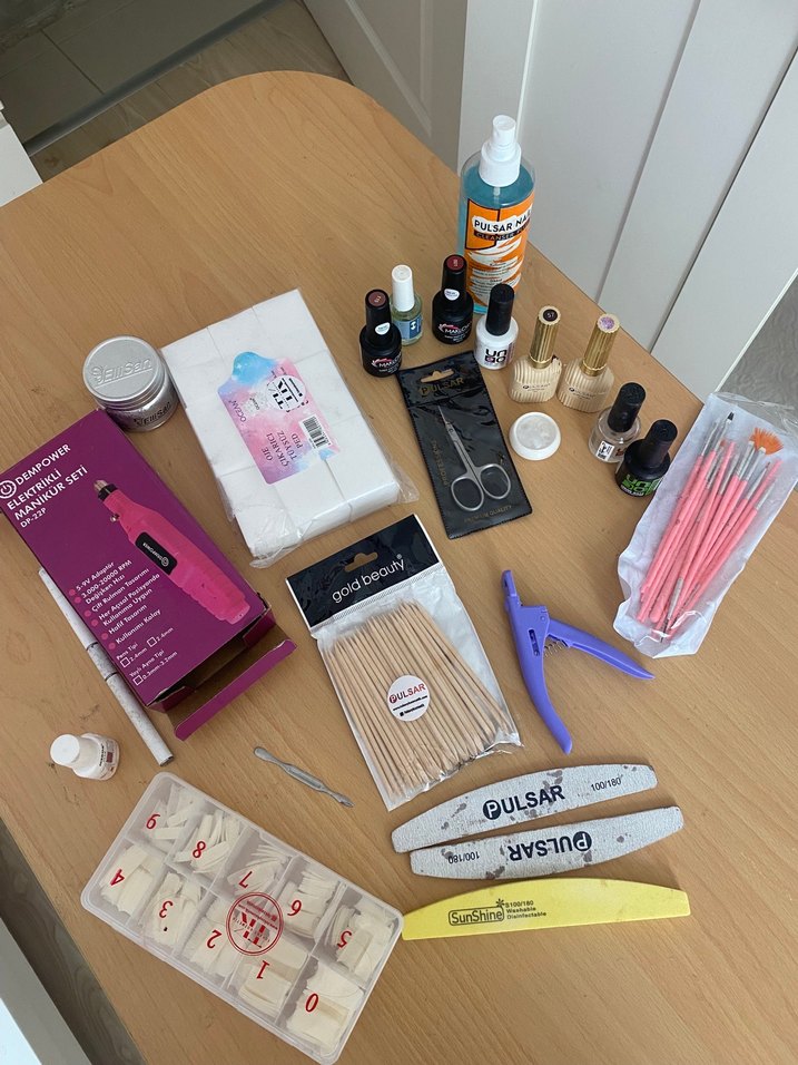 protez tırnak malzemeleri. içinde herşey fazlasıyla mevcuttur. 4 tane kalıcı oje inci tozu ekstradan vardır. hepsi yeni gibidir. cok az kullanılmıştır