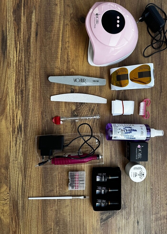 sadece bir kez kullanıldı Setin içerisinde protez tırnak yapmak için gerek duyulan herşey var Setin içinde iki tane jel var sıfır (rakı beyazı ve nude rengi)