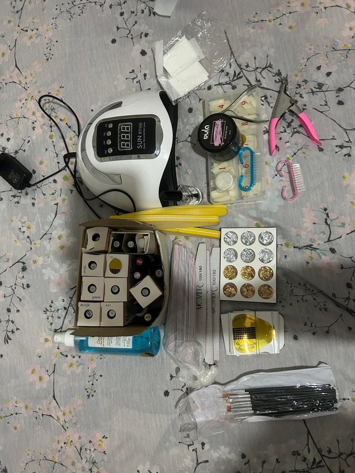 Beyaz renkte LED tırnak lambası, tırnak makası, törpüler, jel, ojeler, primer basecoat topcoat (2 takım),fırçalar ve süsleme aksesuarları içeren protez tırnak seti