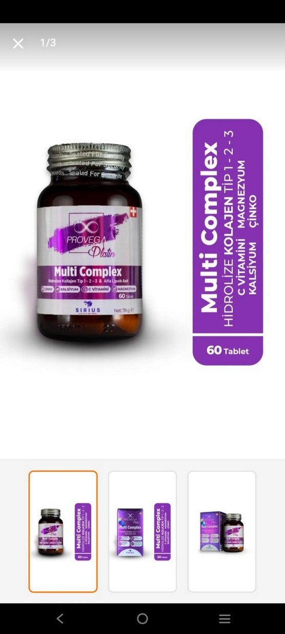 Proveg Sirius Multi Complex, 1, 2 ve 3 tip hidrolize kollajen, C vitamini, magnezyum, kalsiyum ve çinko içerir. 60 tablet.