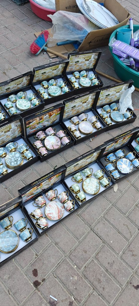 Altın detaylı, mermer desenli çeşitli renklerde 12'li çay fincanı ve tabağı setleri, kutular içinde sunulmaktadır.