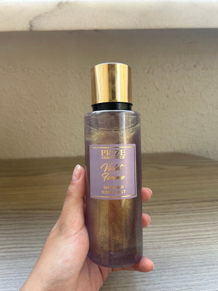 PRZE Shimmer Body Mist, kadınlar için menekşe kokusu ve ışıltılı partiküller içerir. Altın kapakla şık bir görünüm sunar.