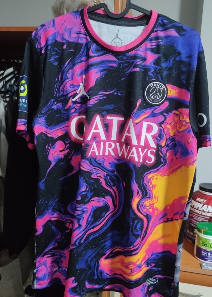 PSG Mbappe özel tasarım forma. L beden az giyildi çok hafif küçük iplik sorunları var foto koydum örnek olarak. başka bir defosu falan yok