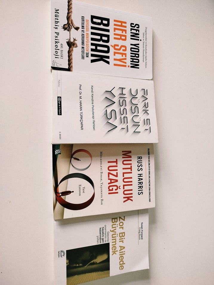 Russ Harris ve diğerlerinin kitaplarını içeren psikoloji ve kişisel gelişim seti, mutluluk, duygusal yükler ve aile zorlukları gibi konuları kapsar.
