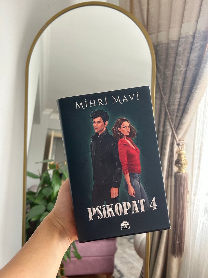 Mihri Mavi'nin Psikopat 4 adlı romanı, sürükleyici bir hikaye ve etkileyici karakterler içerir. Kapakta bir erkek ve kadın sırt sırta duruyor.