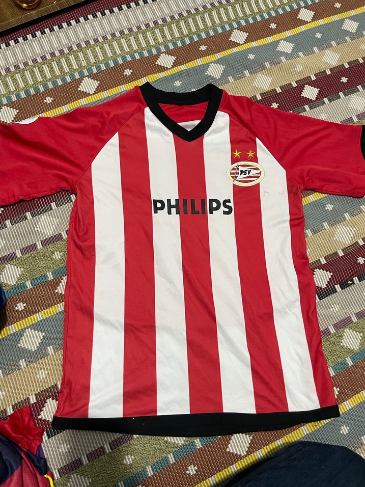 Kırmızı ve beyaz dikey çizgili, kısa kollu ve bisiklet yaka, vücuda oturan erkek spor forması. Velcro detaylı, renkli baskılı ve PHILIPS logosu bulunur.
