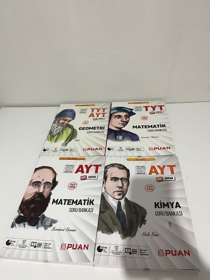 Puan markasının TYT ve AYT sınavları için Matematik, Geometri ve Kimya soru bankalarını içeren set, detaylı pratik sorularla.
