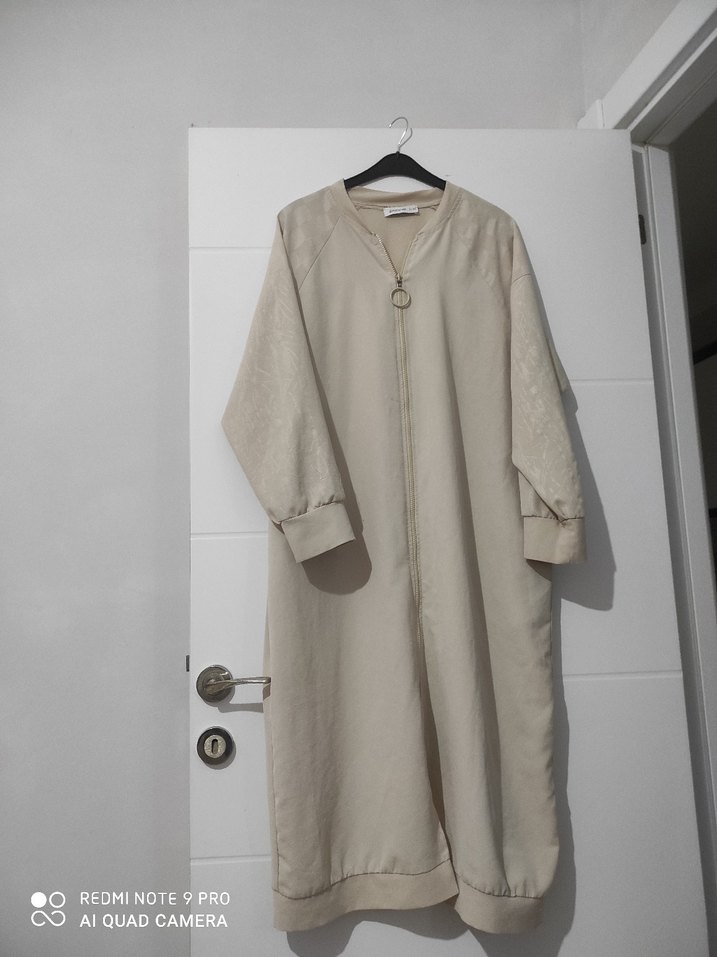 Bej renkli, uzun kollu, bol kesim kadın elbise. Minimalist ve normcore tarzda, desensiz ve uzun boylu tasarım. Fermuarlı, rahat bir model.