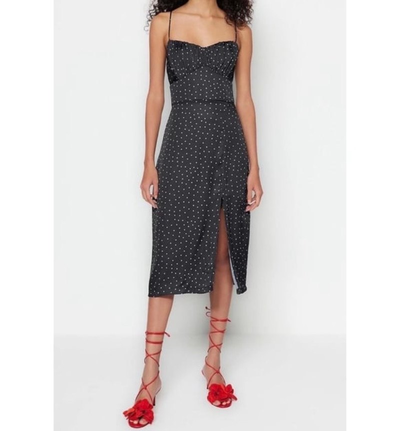 Askılı ve kemerli, siyah ve gri puantiye desenli uzun, vücuda oturan kokteyl elbisesi. Romantik akşamlar için uygun.