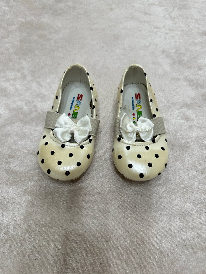 Beyaz zemin üzerine siyah puantiye desenli, önünde fiyonk bulunan kız çocukları için kauçuk babet ayakkabı. Geleneksel tasarım ve renkli iç taban. (5.ç) #bebek #giyim #kıyafet