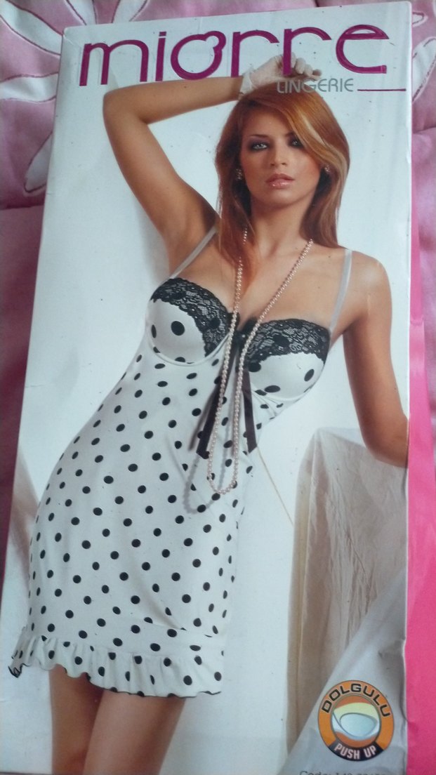Puantiye desenli, dantelli ve ince askılı beyaz mini gecelik, şık ve Paris esintili bir tasarıma sahiptir.