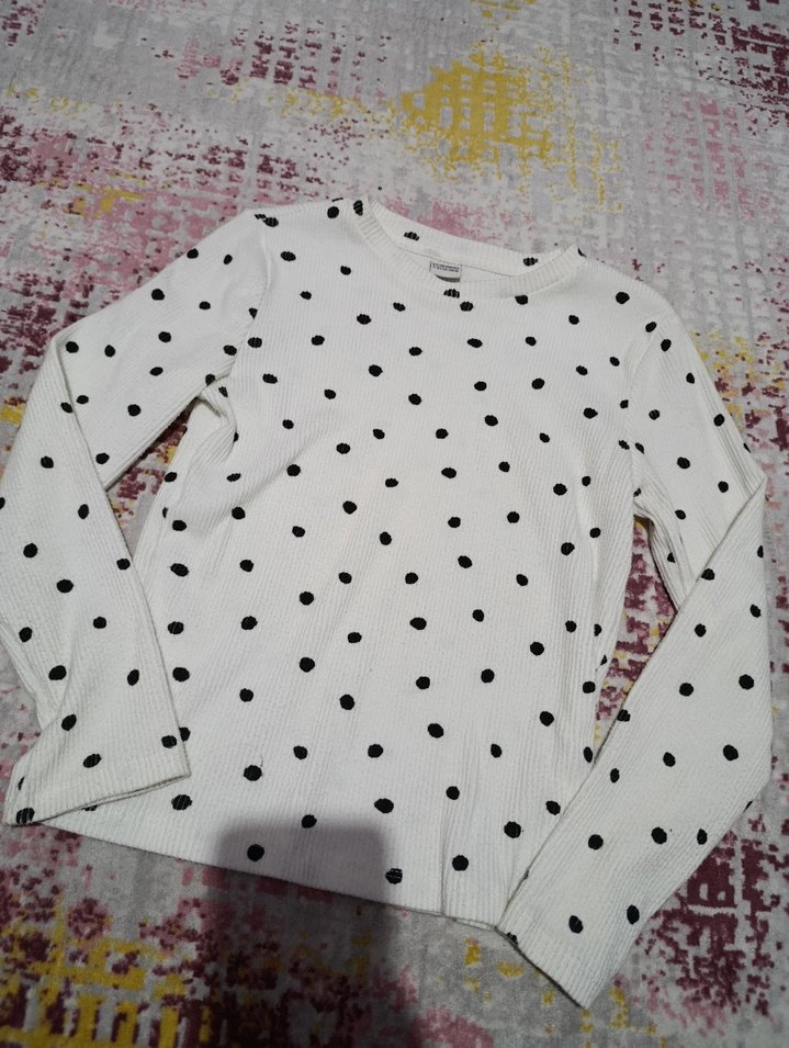 Pamuklu, uzun kollu, beyaz zemin üzerine siyah puantiye desenli, düğmeli detaylı, dar kesim kız tişörtü. Trendy ve rahat kullanıma uygundur.