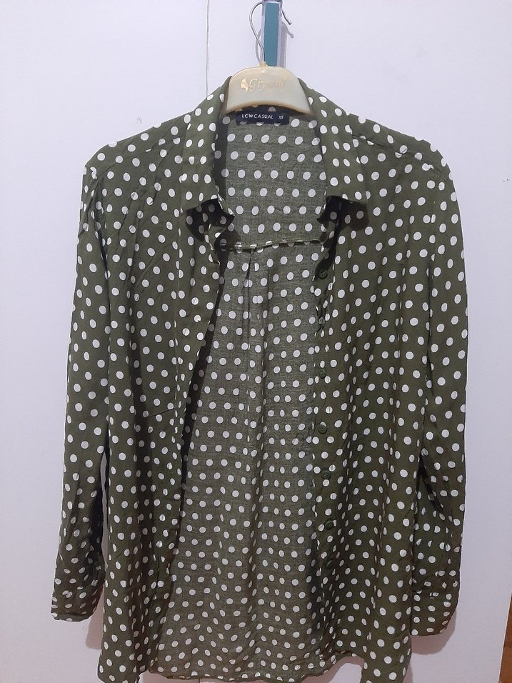 Düğmeli, uzun kollu, notched lapel yakalı, bol kesim kadın gömleği. Khaki renkte, beyaz puantiye desenli, yumuşak sentetik kumaştan üretilmiştir. S bedene de çok rahat olur