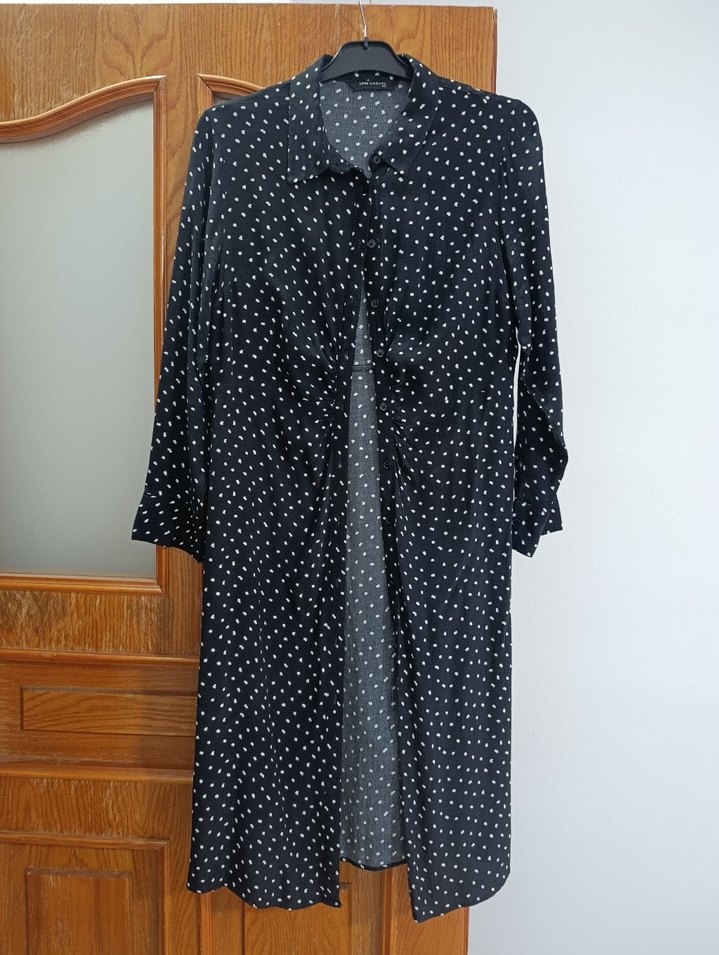 Uzun, bol kesim hamile kabanı düğmeli ve kesik yaka detaylıdır. Siyah zemin üzerine beyaz puantiye deseniyle, rahat sentetik kumaştan günlük kullanıma uygundur.