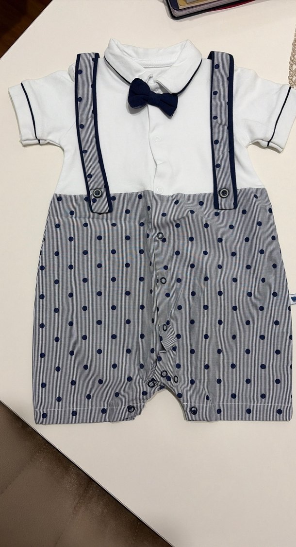 Erkek bebek tulumu, düğmeli ve yakalı kısa kollu tasarıma sahiptir. Pamuk kumaştan üretilmiş, gri beyaz puantiye deseni ve papyon detaylıdır. Özel mevlütlerde , bayramlık olarakta da tercih edilebilir hiç giyilmedi etiketi mevcut değildir sadece .
