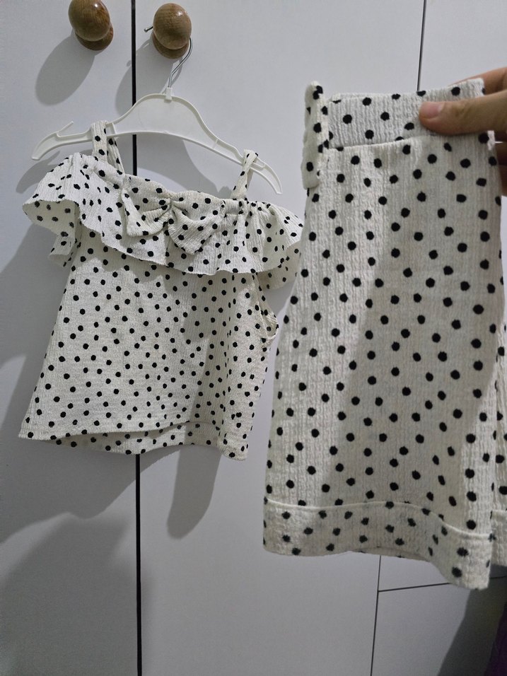 Beyaz ve gri puantiye desenli, fırfırlı askılı üst ve şorttan oluşan bebek kız takımı. Rahat ve şık, sıcak günler için uygun.