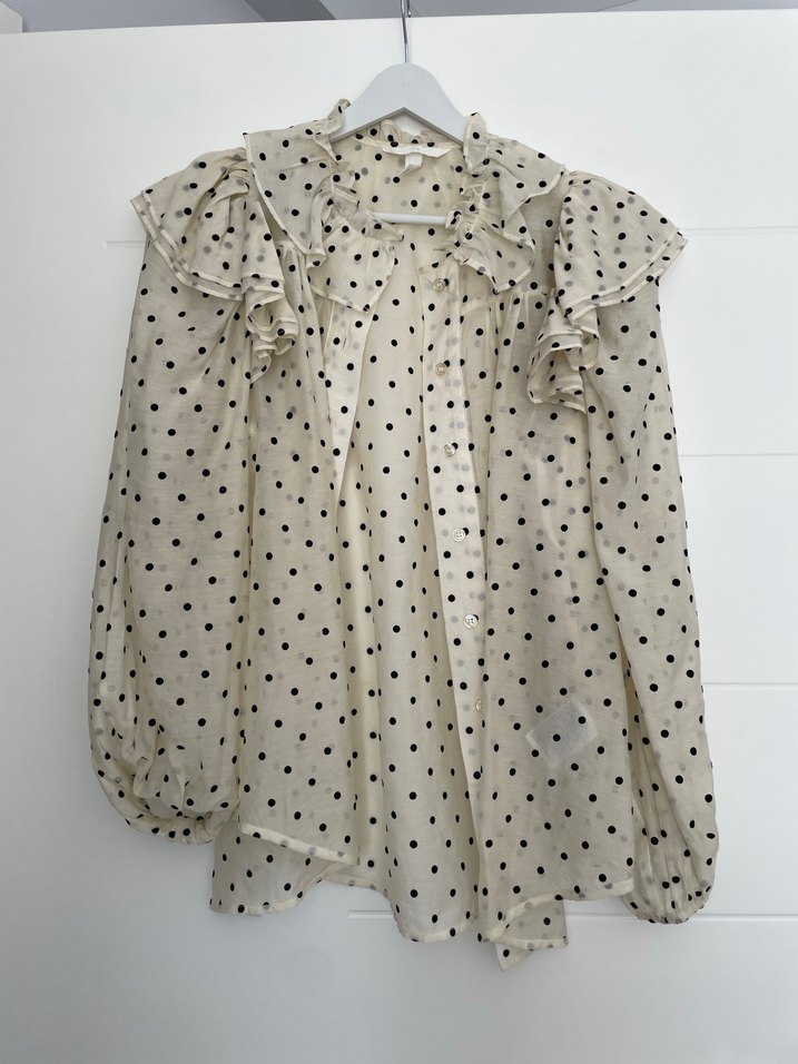 Pamuklu, siyah puantiye desenli, fırfırlı detaylı, uzun kollu, V yaka bol kesim beyaz bluz. Transparan bir model biraz geniş kesimli xs bedeni fakat s-m bedenlerede çok güzel olur