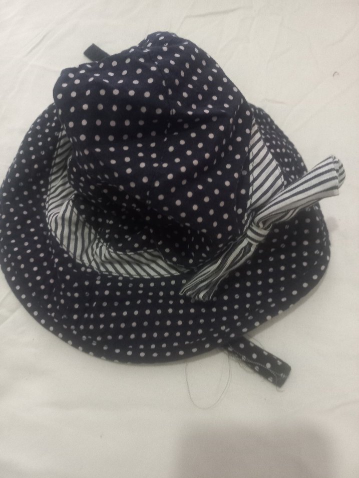 puantiye desenli, fırfırlı detaylı çocuk şapkası. Çizgili fiyonk ve sentetik kumaştan yapılmıştır, bohem tarzında.