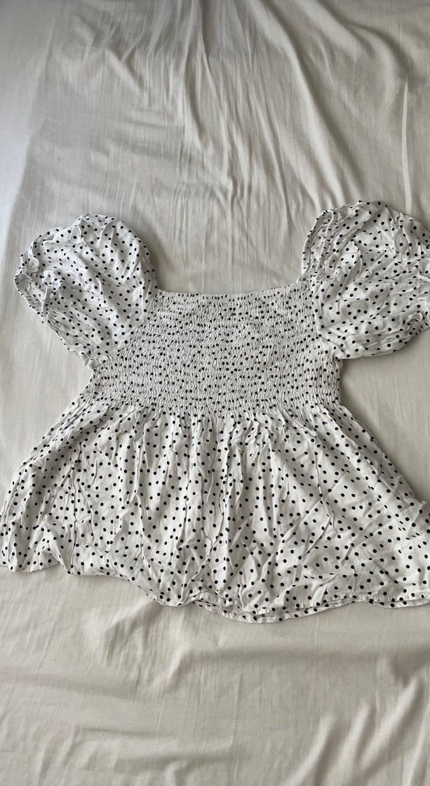 Pamuk kumaştan, beyaz zemin üzerine gri puantiye desenli, balon kısa kollu, fırfırlı ve bol kesim bohem bluz. Defacto