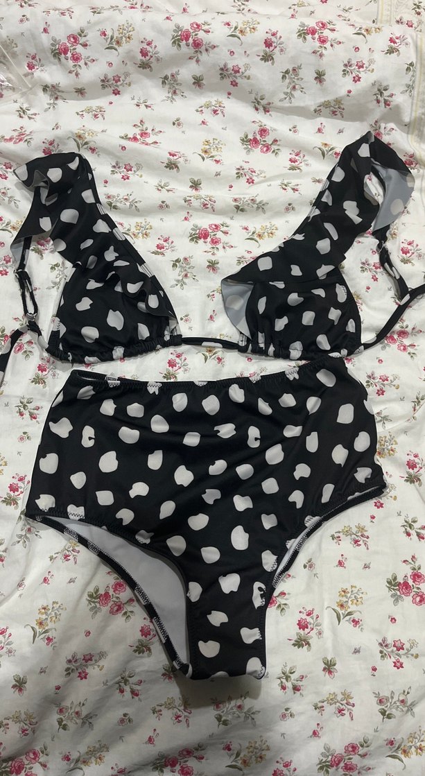 Fırfırlı ve ince askılı, beyaz zemin üzerine koyu puantiye desenli, kısa kesim bohem Paris tarzı yüksel bel bikini. ️