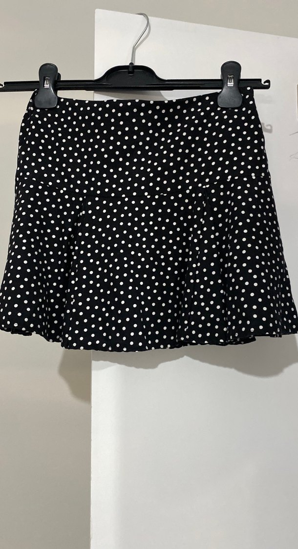 Pamuk kumaştan, siyah zemin üzerine beyaz puantiye deseni ve fırfır detaylı, vücuda oturan mini etek. Günlük kullanıma uygundur. Bir kez giyilmiştir.